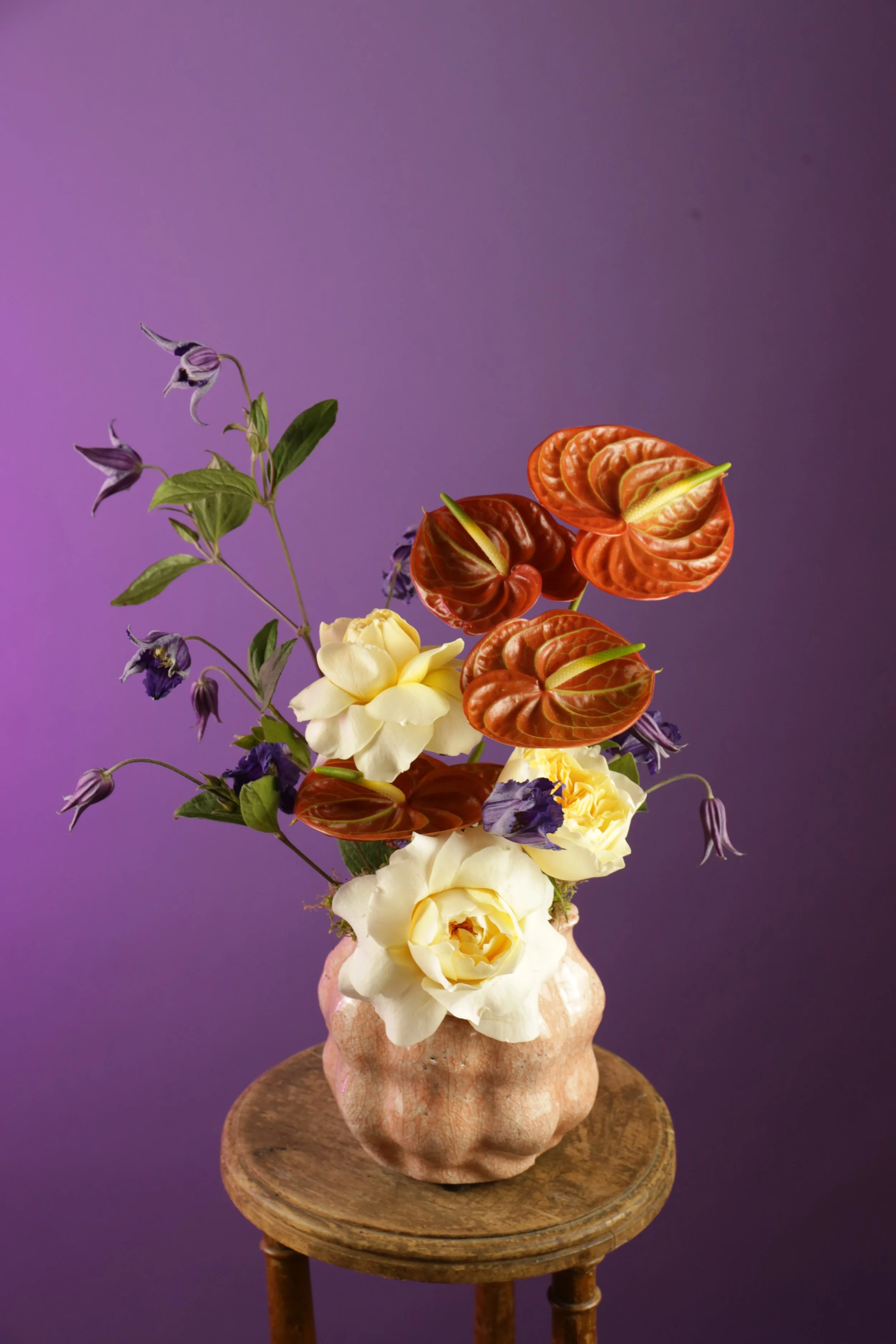 Hermosa combinación de anturios, hortensias y flores silvestres.
